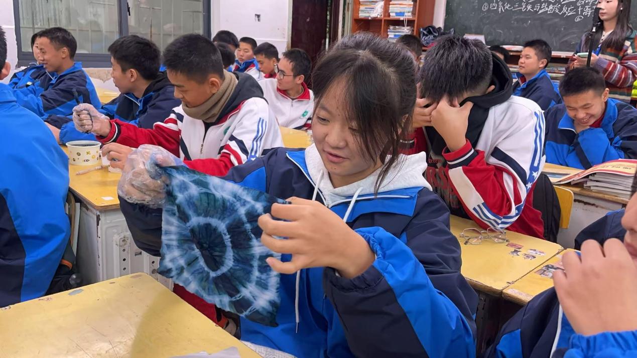 实习教师王语丹在《各异的风土人情—中国民间美术》这节课上,引导员工探索传统民间美术之美,在了解和认识中国民间美术的基本概念、种类及其造型特点后,王老师向员工介绍了湘西苗鼓和张家界蓝染的特点,并让员工以小组合作的形式亲自动手体会张家界蓝染的魅力。课堂寓教于乐,在学中做,在做中学。