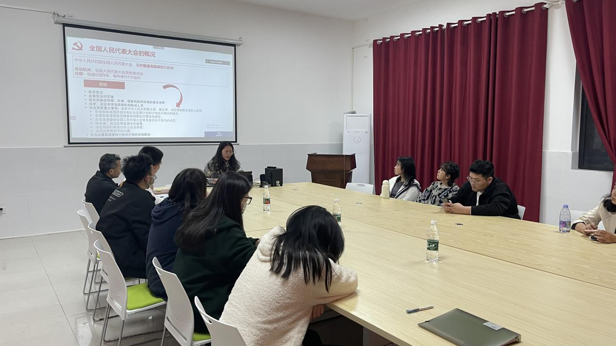 本次主题活动由党员刘鑫铭同志主持,采取线上、线下相结合的方式举行,主题内容围绕2023年3月5日至13日在北京召开的全国人大第十四届一次会议以及习近平总书记在第十届全国人大第一次会议闭幕式上的讲话来开展。刘鑫铭同志对全国人民代表大会的性质、历史进行简单回顾,重点对十四届全国人大一次会议的九个会议议程进行学习,如政府工作报告、国务院机构改革方案、新一届国家领导人、全国人大、国务院组成人员的选举过程等。党员同志观看习近平主席在闭幕式上的重要讲话。