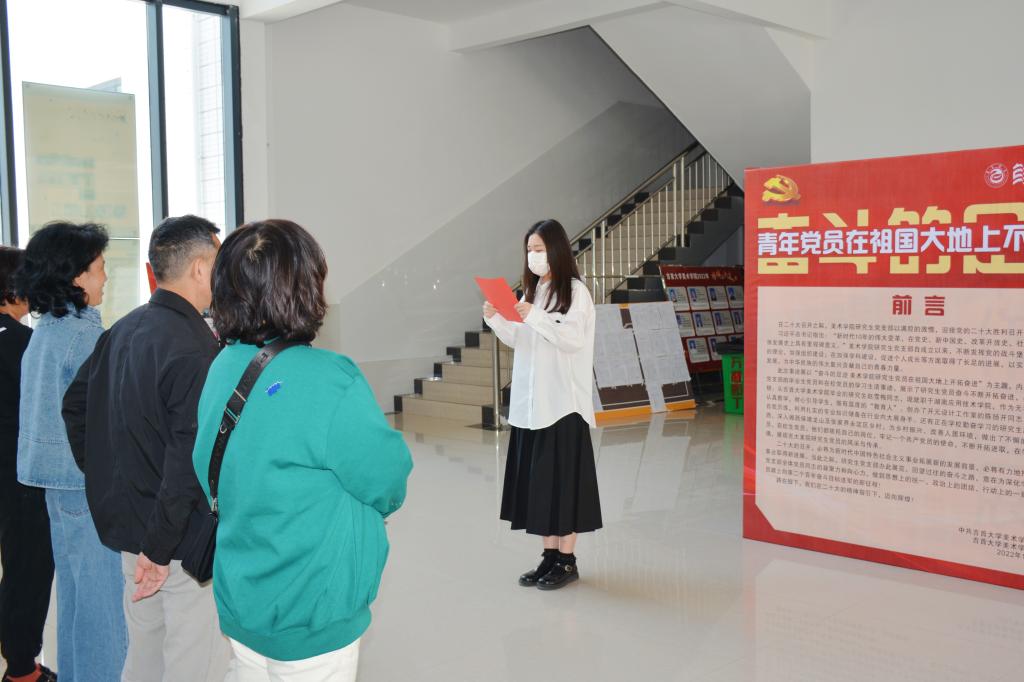 此次事迹展以“奋斗的足迹伟德victor1946官网登录研究生党员在祖国大地上开拓奋进”为主题,内容主要是记录了研究生党支部的毕业和在校的研究生党员代表等十位同志的学习生活事迹,展示了研究生党员群体不断开拓奋进,昂扬不息的精神风貌:他们有从伟德victor1946官网登录毕业的研究生赵雪梅同志,现就职于湖南应用技术公司,作为无私奉献的优秀教师,她认真教学,耐心引导员工,做有温度的“教育人”。有创办了开元设计工作室的陈扬开同志,不断的自我历练,利用扎实的专业知识在行业内大展身手。还有正在公司勤奋学习的研究生赵二保同志,扎根大湘西,深入保靖、龙山及张家界永定区乡村,为乡村振兴、改善人居环境,做出了不懈的努力。这些党员同志都依托自己的岗位,牢记一个共产党员的使命,不断开拓进取,在学习生活中淬炼红色灵魂,展现吉大美院研究生党员的风采与传承。