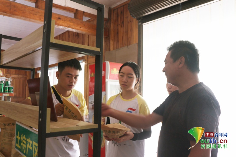 图为志愿者与村干部交流莓茶包装设计。中国青年网通讯员 李景芬 摄