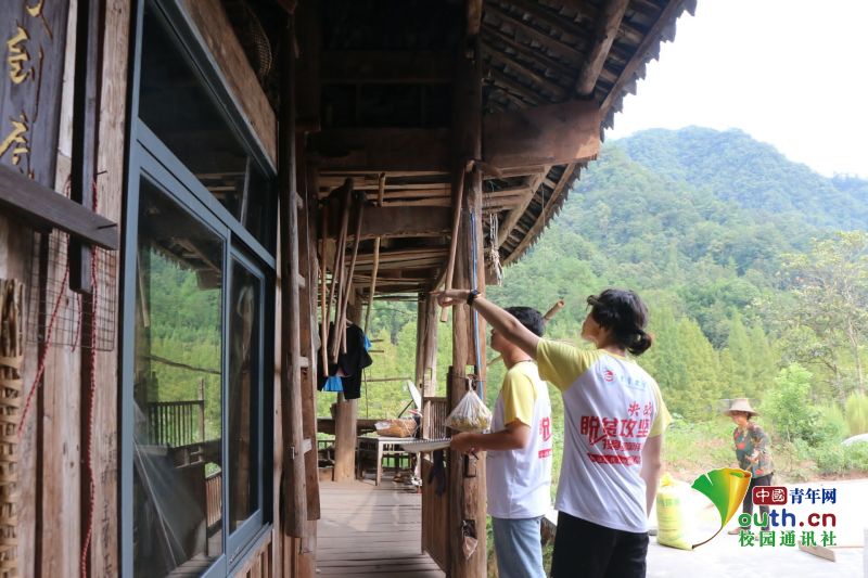 图为志愿者与村民交流吊脚楼的建筑造型和风格。马头溪村的吊脚楼风格以两进两重堂、双手推车吊脚、钥匙头、一字长龙、转阁楼等为主。中国青年网通讯员 李景芬 摄