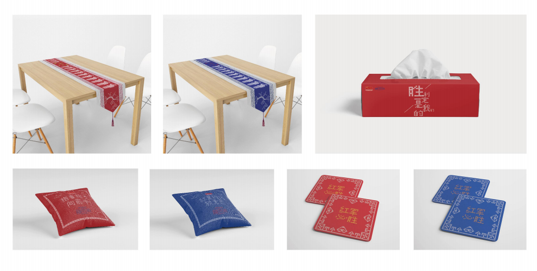 参赛作品“马桑树之恋”——马桑树儿搭灯台布艺套组,由公司李波荣、赵忠鼎老师指导,美术与设计工作室员工创作。作品巧妙的运用红军和土家阿妹的形象来代指贺敬斋和妻子戴桂香,结合土家蜡染、土家挑花技艺、桑植民歌融入《马桑树儿搭灯台》中,用马桑树和灯台树休戚与共的关系来诠释二人“钥匙不来锁不开”般忠贞不渝的爱情故事。