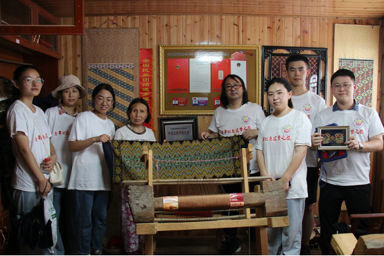 从老前辈彭心宽家中离开后,小分队一行前往土家织锦国家级传承人刘代娥老师家中拜访学习,深入了解了土家织锦的传统图案及其所蕴含的丰富文化内涵。小分队成员积极地参与到织锦的生产中,在刘代娥老师的耐心讲解与悉心指导下,通过切身实践对土家织锦的制作过程有了进一步的熟悉。小分队成员与刘代娥老师一同探讨了土家织锦的传承与发展的有关问题。小分队队员赵二保表示,未来将利用自身在环境设计方面的专业优势,通过对土家织锦在村落环境建设中的应用研究来传承与发展土家非遗文化。