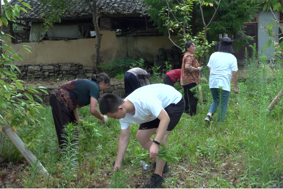 在当地村民的带领下,小分队成员投入到村容村貌环境整治活动中。在阴沉闷热的天气下,队员们弯腰、低头、拔草、迈步……汗水顺着脸颊流淌,印有“青年红色筑梦之旅”的T恤几乎被汗水浸透,尽管期间天降阵雨,但队员们拔草的动作不曾停息。在队员们与村民的密切配合下,仅用不到两个小时,就完成了主干街道旁的杂草清理任务。