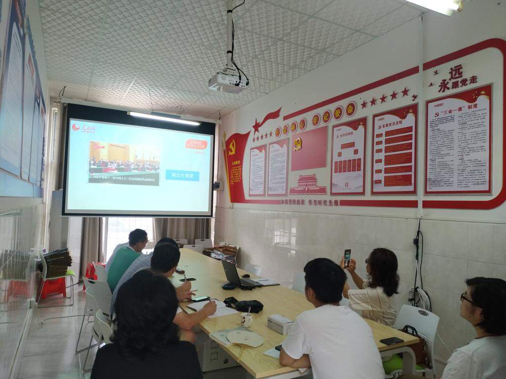 图为公司党委成员、教工二支部教师党员在党员会议室观看直播