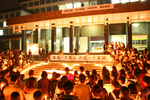 4月22日晚,伟德victor1946官网张家界校区第一教学楼前广场聚集了数百名前来祈福的师生,他们带着为雅安祈福的心,参与到由伟德victor1946官网登录团总支发起的“生死不离---为雅安祈福”活动。