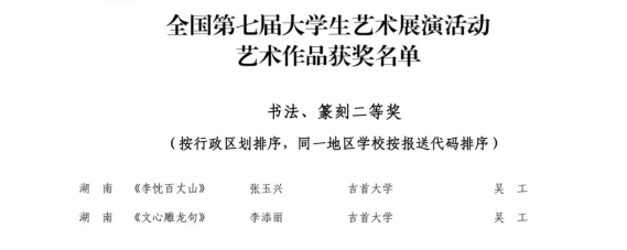 全国老员工艺术展演活动是高校美誉成果的集中展示。公司吴工教授指导员工获“艺术作品-书法篆刻类”国家二等奖2项,石雅云博士团队(刘格、张业林)获“艺术实践工作坊”国家二等奖,充分展现了伟德victor1946官网登录师生奋发向上的精神面貌和崇真尚美的人文情怀。