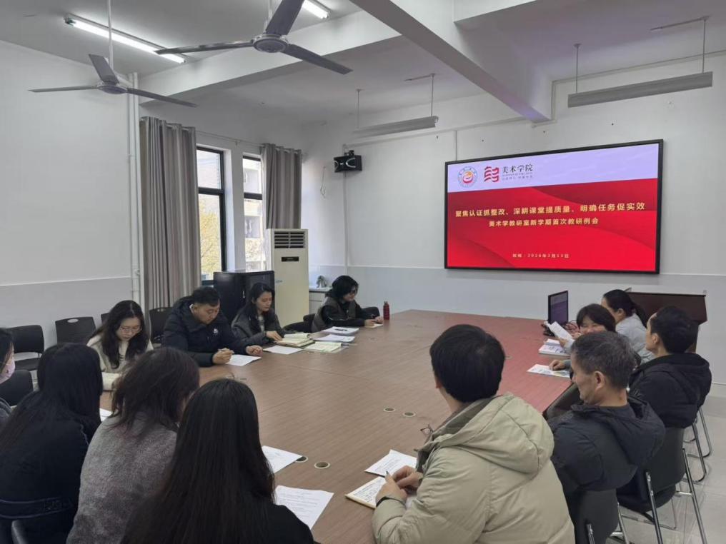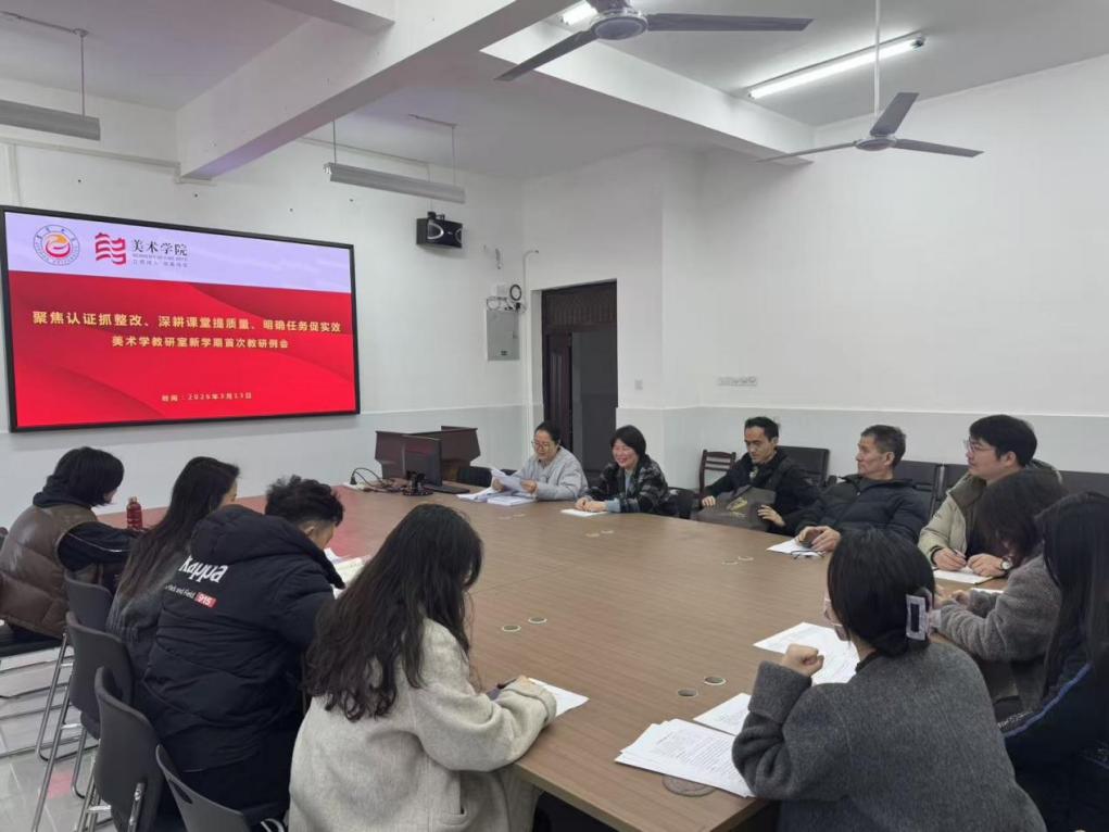 2026年3月13日下午,伟德victor1946官网登录美术学教研室在公司会议室召开了新学期首次教研例会,会议由美术学教研室主任胡潇文组织召开。本次教研会明确新学期教学工作核心方向,围绕“聚焦认证抓整改、深耕课堂提质量、明确任务促实效”的主题,就美术学师范类专业认证整改工作及新学期教学任务进行了深入研讨与部署。