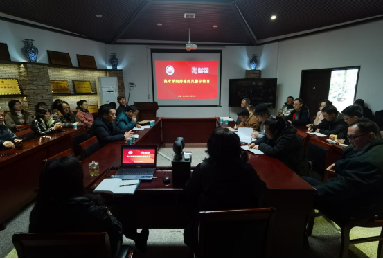 龙斌副书记从近年来教育部通报的及公司常见的违反师德师风的典型案例谈起,详细解读了教育部、省纪委及公司出台的相关文件,如:《教育部关于高校教师师德失范行为处理的指导意见》、《教育部印发新时代教师职业行为十项准则》、《严禁教师违规收受员工及家长礼品礼金等行为的规定》、湖南省纪委关于印发《关于党和国家工作人员操办婚丧喜庆事宜的暂行规定》等,并对公司的师德师风建设提出了指导性的意见:一要认清形势,提高认识,充分认识到师德师风建设的重要性;二要敬畏职责,切实抓好师德师风建设;三要敬畏职业,争做“四有”好教师;四要敬畏法纪,严守底线。