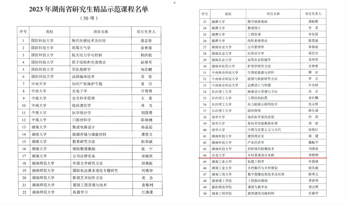 近日,湖南省教育厅公布了2023年湖南省研究生精品示范课程,省教育厅组织专家会议评审,认定湖南省研究生精品课程50门。公司硕士研究生导师李婷婷的“乡村景观设计实践”立项2023年湖南省研究生精品示范课程。