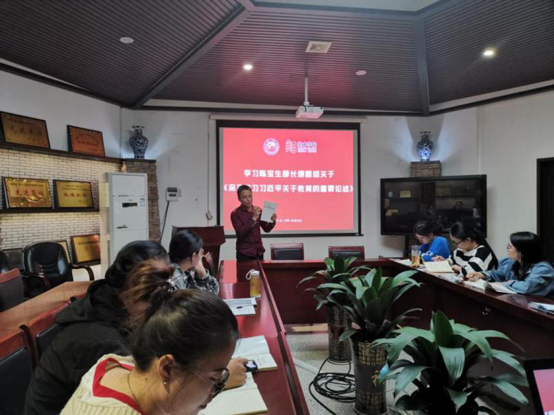 胡显斌书记首先提出当代老师和同学要珍惜给精神补“钙”的机会。通过其自身阅读论述,发现论述可以解决我们观念中的两大问题。并提出疑问,通过9月中旬到11月中旬连续三个月的系统的主题教育学习,如何让老师和同学外驱力的学习变成内驱力学习呢。第一,作为教师党员要不要系统地、认真地学、扎扎实实学?习近平总书记在《十九大报告》中指出“革命理想高于天”,在《紧紧围绕坚持和发展中国特色社会主义,学习宣传贯彻党的十八大精神》中指出“理想信念就是共产党人精神上的‘钙’”。第二,“在进行一线教学和科研的同时,要不要认真学系统地学?”习近平总书记《在北京大学师生座谈会上的讲话》指出“要坚持教育者先受教育,让教师更好担当起员工健康成长指导者和引路人的责任。”