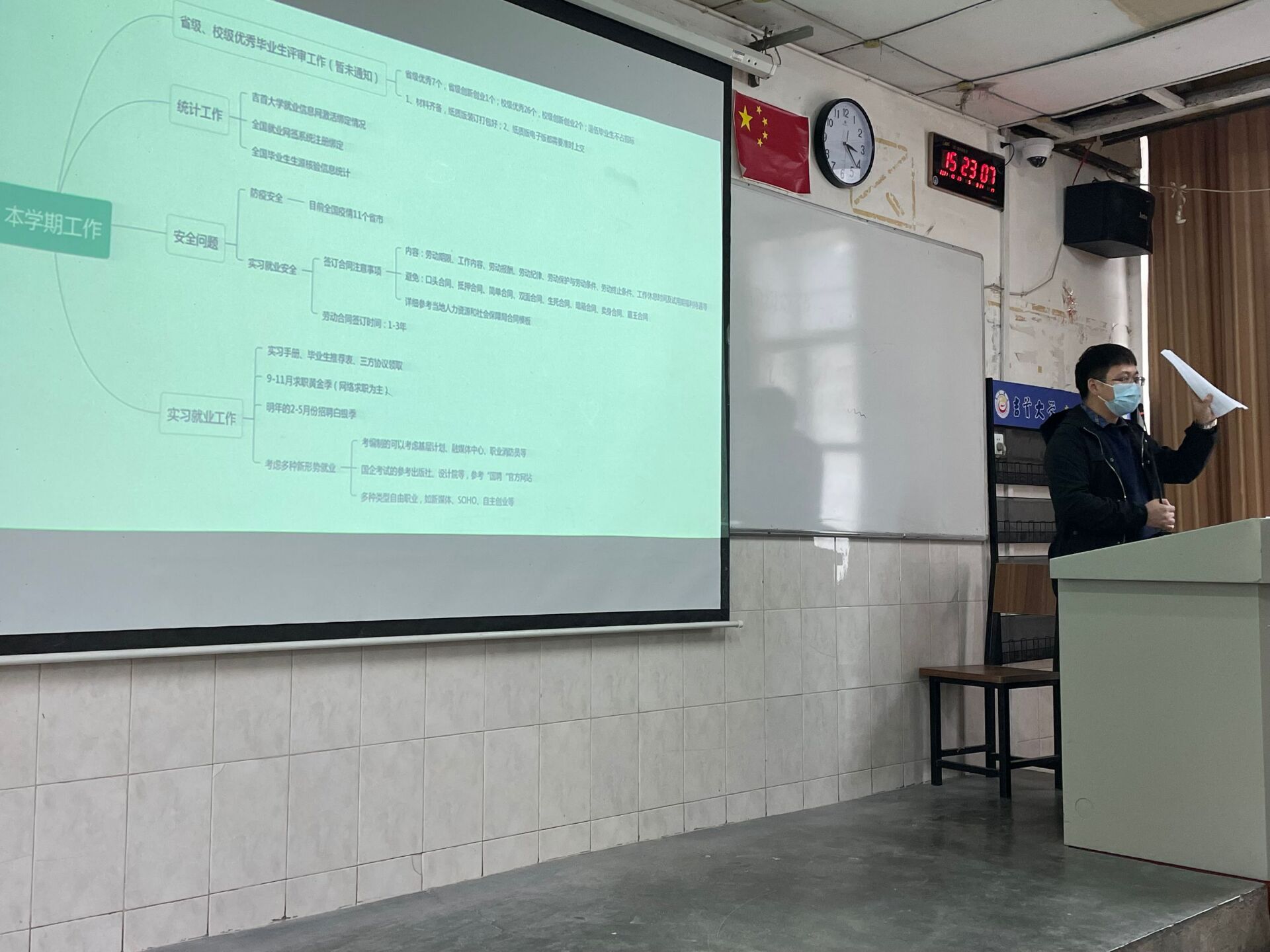 大会按照朱超老师主讲毕业生资格审查相关问题,刘浩老师主讲后续毕业就业具体工作部署,各教研室主讲具体毕业设计与实习相关安排,会内答疑,杜修望副书记总结5个流程进行。